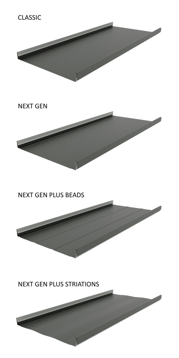 NEXT GEN PLUS BEADS and NEXT GEN PLUS STRIATIONS provide maximum rigidity and ripple control for high-visibility applications, re-roofing projects, glossy or metallic finishes, and long panel spans where oil canning control is critical.